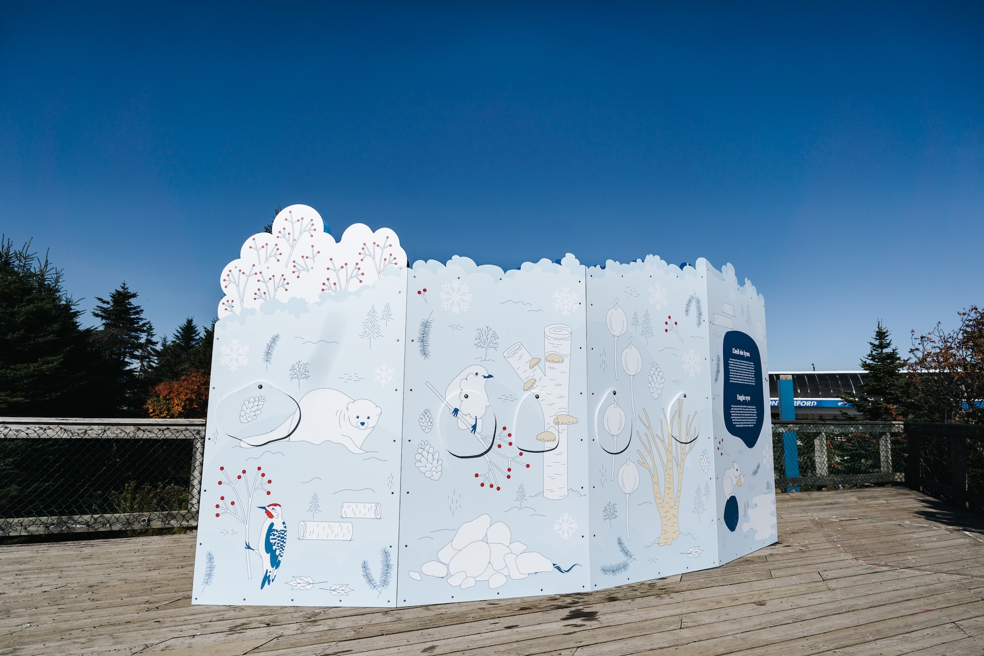 La création d’un système pour enrichir l’expérience des visiteurs sur quatre saisons se base sur la famille de signalétique préalablement créée et implantée en 2022. Nous développons ainsi des interventions interprétatives aux belvédères, intégrant graphiques, illustrations et structures durables. Chaque point de vue devient un espace d’apprentissage, permettant de comprendre le paysage environnant, tout en proposant une approche ludique pour les jeunes de 8 à 15 ans. L’objectif : révéler le Mont-Orford autrement, sans jamais détourner l’attention du panorama naturel.